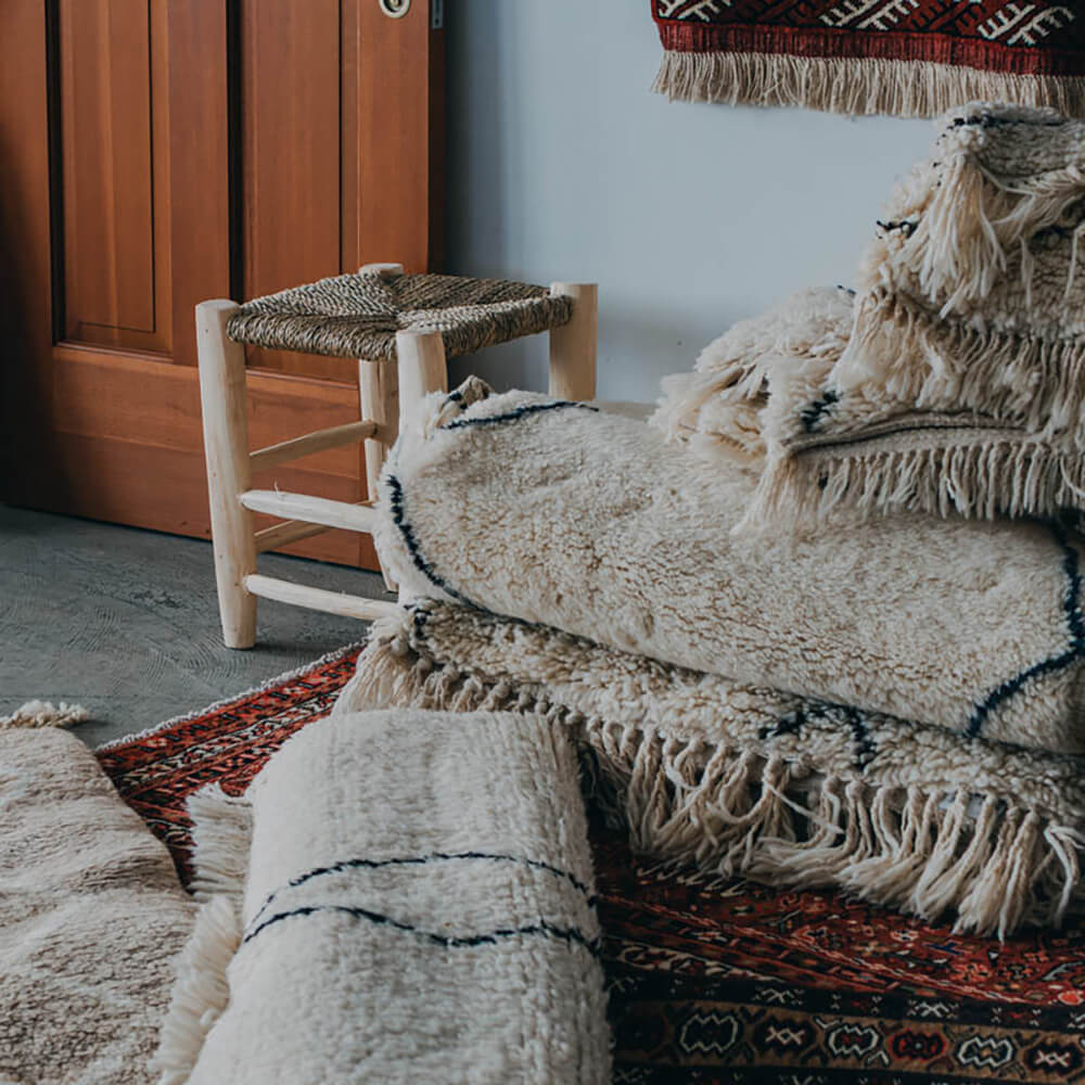 モロッコのアトラス山脈周辺で織られてきた、ウールの手織りラグの代表格。